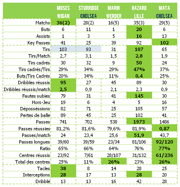 On peut noter les similitudes de Victor Moses avec Daniel Sturridge (en surlignage bleu notamment) ou Marko Marin ainsi ses différences plus nettes avec Eden Hazard ou Juan Mata au niveau du volume de jeu et des transmissions. De plus, le Nigérian présente de loin les meilleures statistiques défensives, un point qui a son importance dans une équipe de Chelsea qui cherche toujours son équilibre (voir Comment Chelsea a perdu face au Milan en pré-saison ?).