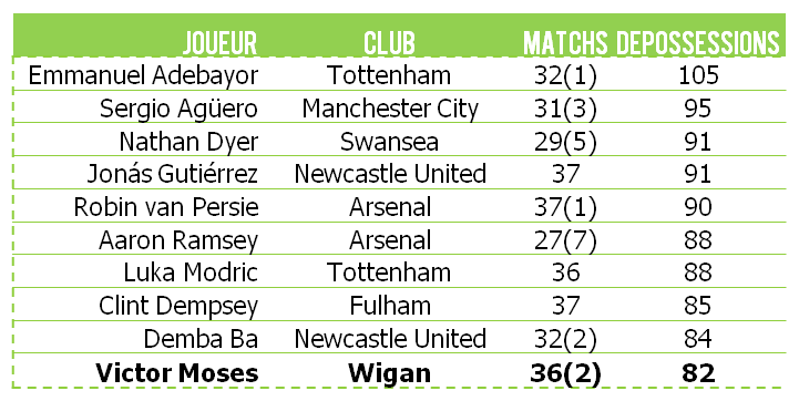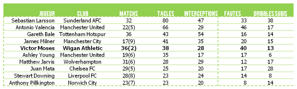 Si Victor Moses ne se situe pas au niveau des poids-lourds défensivement à son poste d’ailier (Larsson, Valencia…), il présente toutefois des statistiques intéressantes témoignant de l’aspect concret de ses retours défensifs. Le tableau est rangé selon le nombre de tacles réussis.
