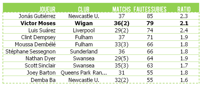 Note: Le classement Européen situe Victor Moses dans un top 20 s’échelonnant approximativement entre 80 et 100 fautes subies.