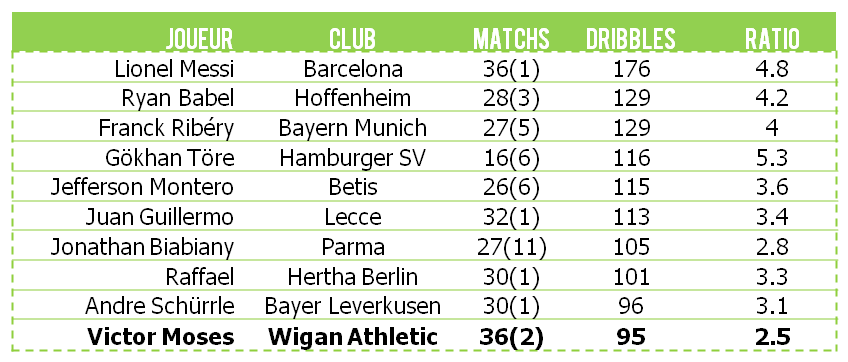 Ci-dessous, le classement des dribbles réussis en Europe en 2011/2012. Dixième de ce classement, Victor Moses ne devance que d’une unité… Marco Reus!