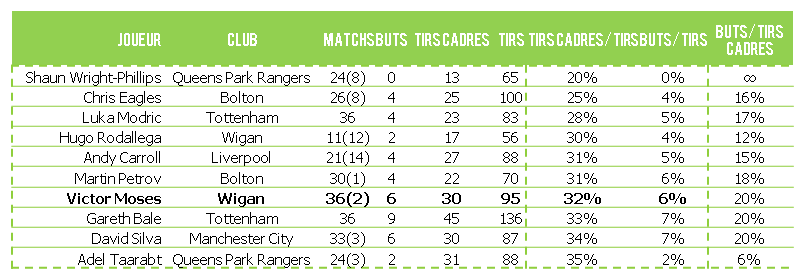 Ci-dessous: le classement des cancres du Championnat en ce qui concerne la conversion en buts de leurs frappes.
