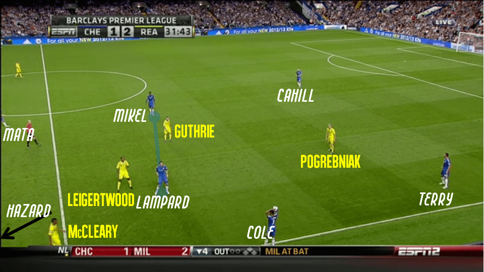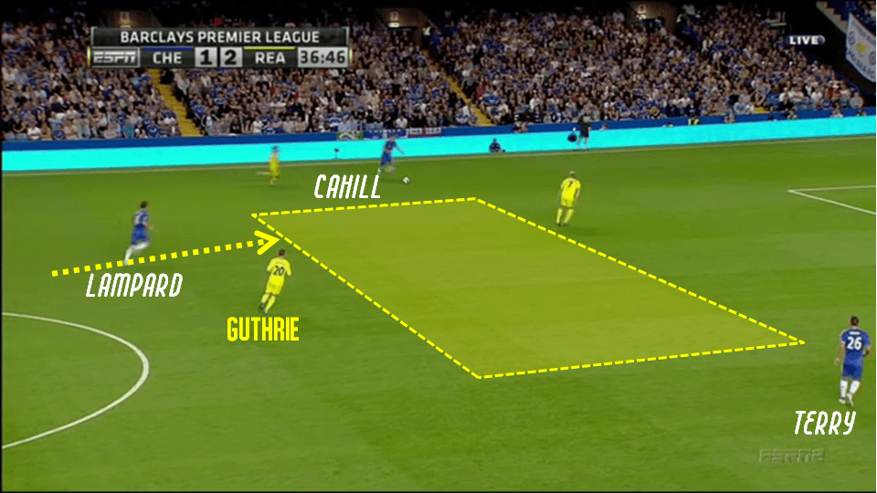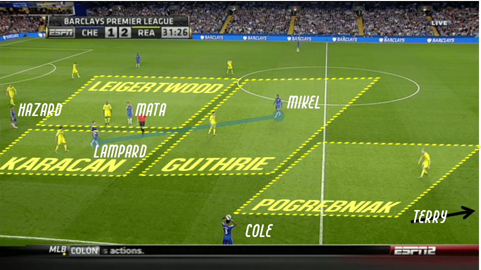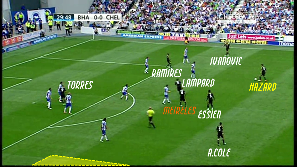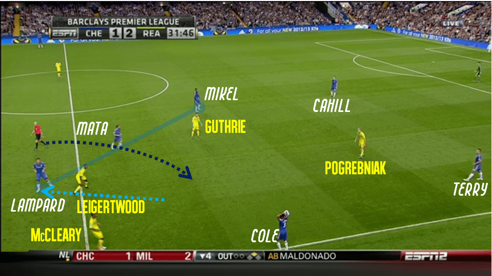 Ce manque de disponibilité se répercute directement sur la ligne du milieu de terrain où Lampard et Mikel manquent assez souvent de solutions de passe pour conserver le ballon avant de placer les attaques et trouver la faille. L’absence d’un véritable lien entre le “double pivot” et la ligne de trois joueurs offensifs amène d’ailleurs Lampard à devoir régulièrement déborder de son rôle afin de créer ce lien, sans pour autant trouver davantage de mouvement plus haut mais en laissant dès lors l’axe encore un peu plus découvert.