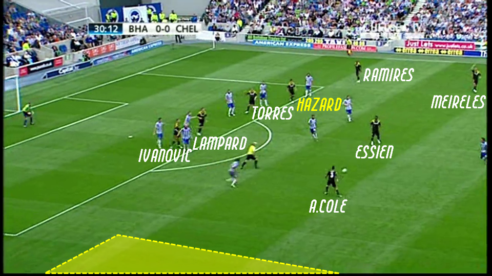 Cependant, à l’instar de ce qui était déjà possible de noter dès la pré-saison, Hazard semble s’être vu confier pour zone de jeu le dernier tiers adverse, peut être afin de maintenir sa présence et lucidité dans le tiers décisif. Il est en effet rare de voir l’ancien joueur de Lille décrocher plus bas en se rendant suffisamment disponible notamment afin organiser le jeu. Hazard se contente en effet assez souvent d’être recherché de façon directe avant d’éliminer son adversaire par un contrôle orienté, se retrouvant ensuite face au jeu afin de percuter le rideau adverse et se rendre décisif (voir les occasions de but face aux Seattle Sounders, la passe décisive pour Ivanovic à Wigan ainsi que pénaltys obtenus face à Wigan et Reading).