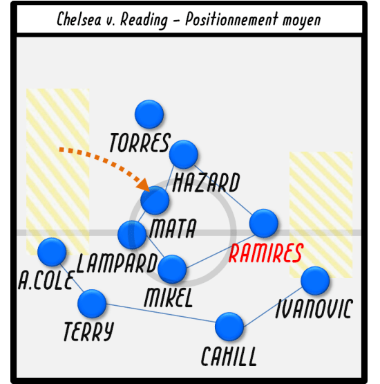 Si Mikel était principalement en charge de compléter ses défenseurs en 4-3-3, son association avec Frank Lampard dans un “double pivot” va voir ses consignes de déplacements modifiées dans la mesure où il doit désormais uniquement se préoccuper du positionnement de l’Anglais et se placer en couverture/soutien à une distance constante. Cela n’a toutefois pas freiné les velléités offensives d’Ashley Cole et Branislav Ivanovic dont les montées contribuent à fournir la largeur que Mata, Hazard ou Sturridge refusent par leurs plongées systématiques vers l’axe.