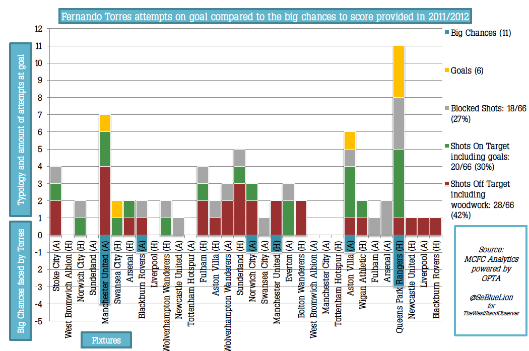 Here, the graph tries to show that Torres wasn’t that inefficient in front of goal than the opinion could be likely to think in regard of the heavy mediatic coverage. As an illustration, the former Liverpool striker has been provided just 11 clear cut chances (big chances) and scoring 5 of them, including twice games in whom all clear cut chances were converted into goals (Aston Villa and Queens Park Rangers). Twice non taken big chances prevented a win, against Norwich City (0-0) and Manchester United (3-3), with the postulate that the scoreline wouldn’t change after Torres’ converted big chance. The volley over the bar in stoppage time at Ewood Park didn’t prevent Chelsea to come back from Blackburn with 3 points after Lampard’s earlier goal.