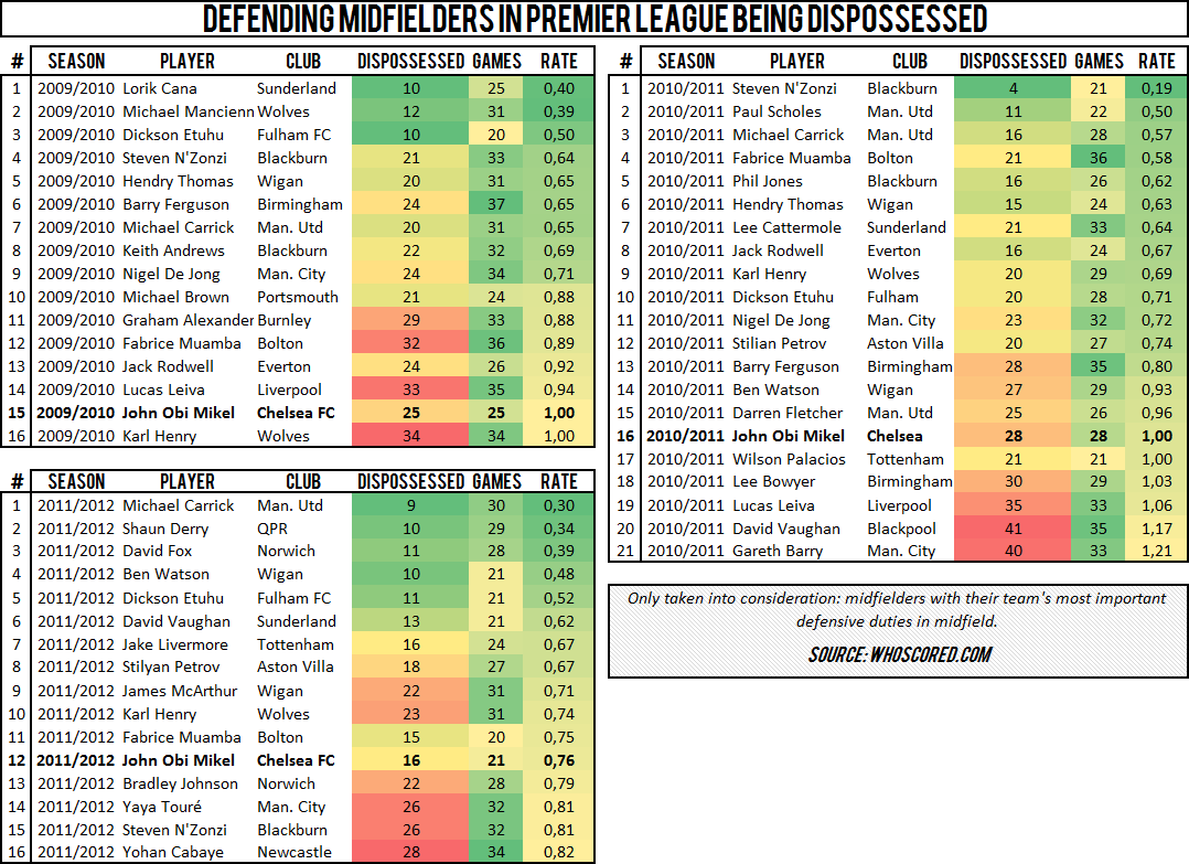 (2): Here’s the less dispossessed defending midfielders table for the last 3 seasons. Being dispossessed means losing control of the ball by being tackled by an opponent.