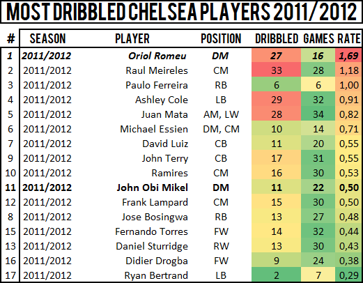 (4): Here’s Chelsea’s most dribbled players table: With his will to intercept and his defensive naivete, Chelsea had to adapt to Romeu’s play. At that moment Chelsea had 3 aligned midfielders rather than one midfield behind two others as it used to be in the past (with Mikel). In that configuration, cope with transition phasis was even more harder.