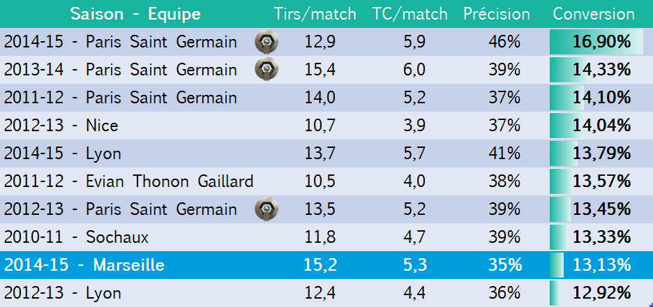 Dans l’histoire statistique récente de la Ligue 1 (comprendre : l’ère des données ouvertes, soit depuis 2009-10), quatre équipes sont parvenues sur la durée d’une saison à présenter un ratio de conversion supérieur à 14% (1 pour 7). Deux auront dépassé la ligne des 16% : la tentative d’Ocampos (d’au moins un mètre !) et le Paris Saint Germain, champion de France 2014-2015 (16,9%).