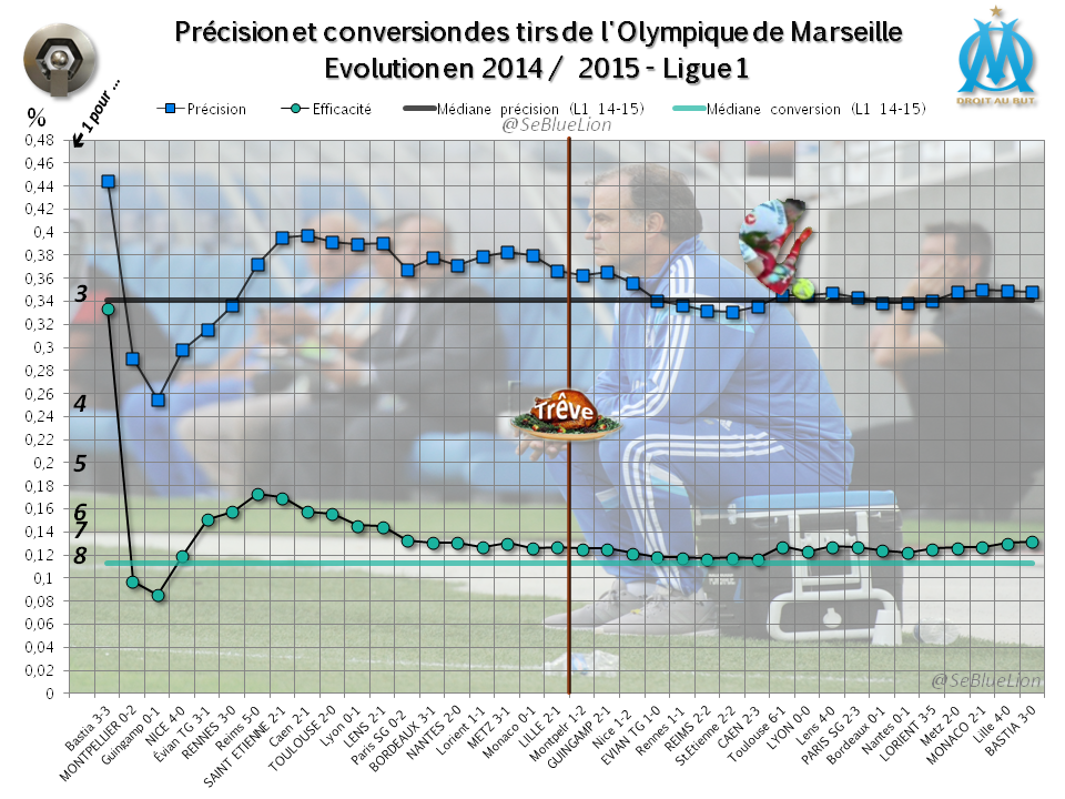 A partir de la trêve et de façon continue jusqu’à la clôture de la saison, les valeurs de précision et conversion des tirs de l’OM se sont rapprochés des valeurs médianes. De là, je pose deux questions :