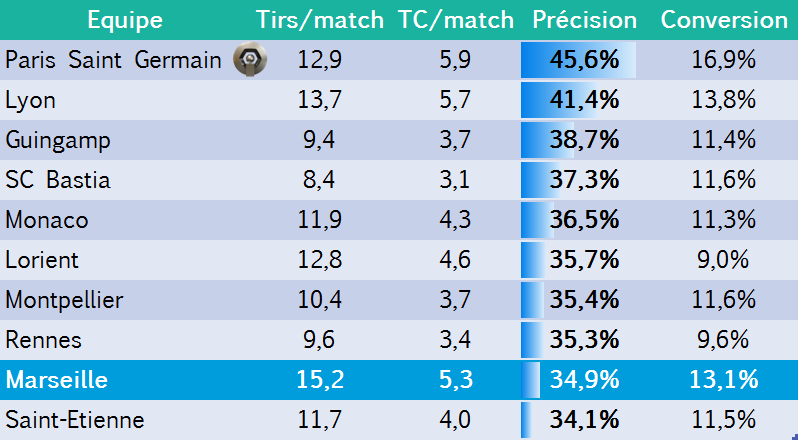 Equipe la plus prolifique de Ligue 1 en 2014-15 en matière de tirs au but (15,2 tirs par match), l’OM est cependant devancé par l’OL et le PSG en termes de tirs cadrés (5,3 contre 5,7 et 5,9 respectivement). Le rapport de ces deux valeurs (autrement dit: la précision des tirs) place l’Olympique de Marseille au 9e rang du championnat avec seulement 34,9% de tirs cadrés.