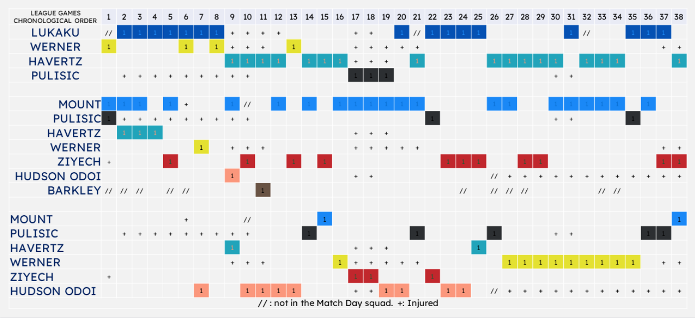 Mount’s role under Tuchel (mostly starting from the right 10 position) leaned more and more towards the right side to create space, and link up with James. More on that later, but it raises questions as to how much it was by design or essence.