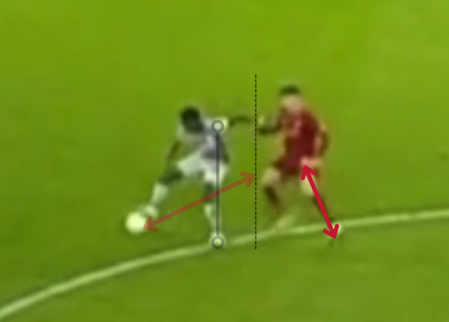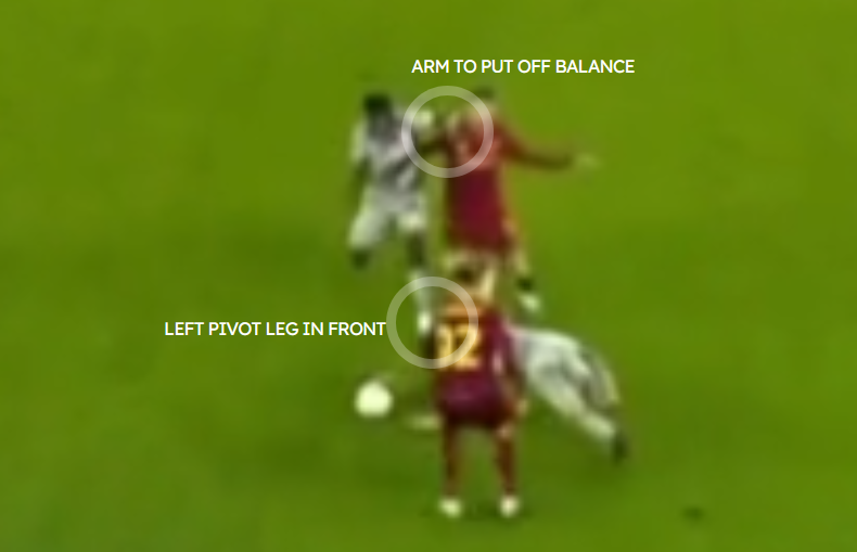 On the first play, getting the left leg pivot foot in front, in the prime position (whoever gets there first gets a touch on the ball with the other leg) is key to not let the Roma defender get in front (he actually bounces off Gourna)