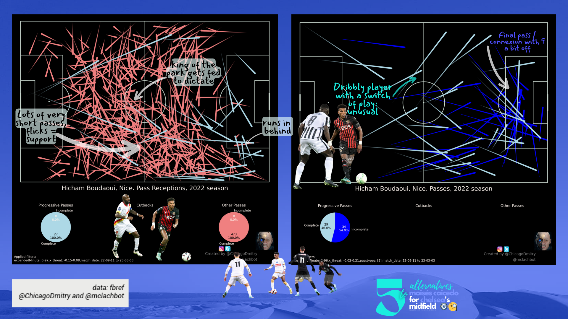In terms of progressive passes, Boudaoui has some nice “progressive” crossfield passes, on the ground or in the air.