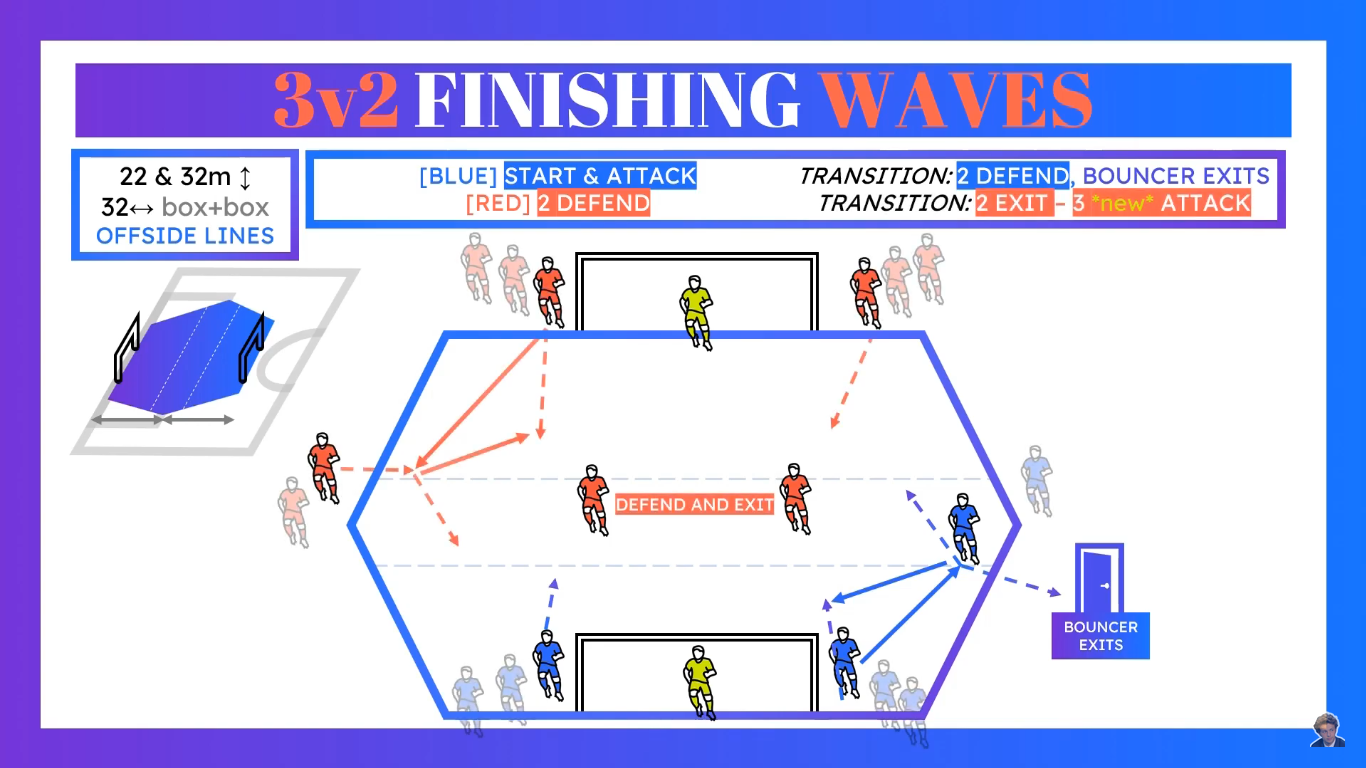 The point is to repeat actions at a high frequence (3v2 becomes 4v3, meaning the 3 who attacked become defenders because 2 players join the party alongside the 2 who were defending). There’s a lot of variations, 1v2 3v2, 3v2, 4v3 etc… ideally you want players to get involved in two consecutive sequences before making way, so that they’re forced to stay switched on for the immediate transition