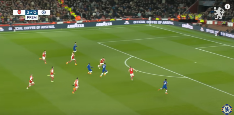 Kiwior, as mentioned, does a good job floating in the middle of the V (being the scope of Kanté’s options: Havertz or go himself (or slide it to Noni)