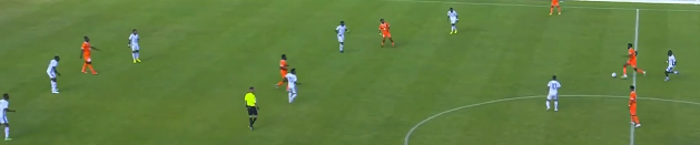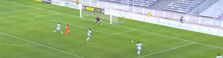 The stuttering (left-left) before playing the masked pass is good, thatâs good footwork to be able to use his right but setting his left foot right beside the ball.