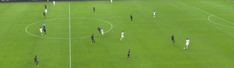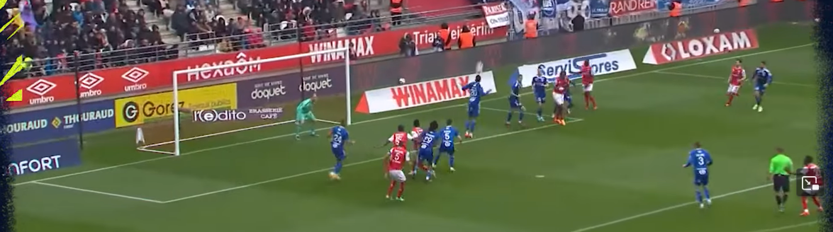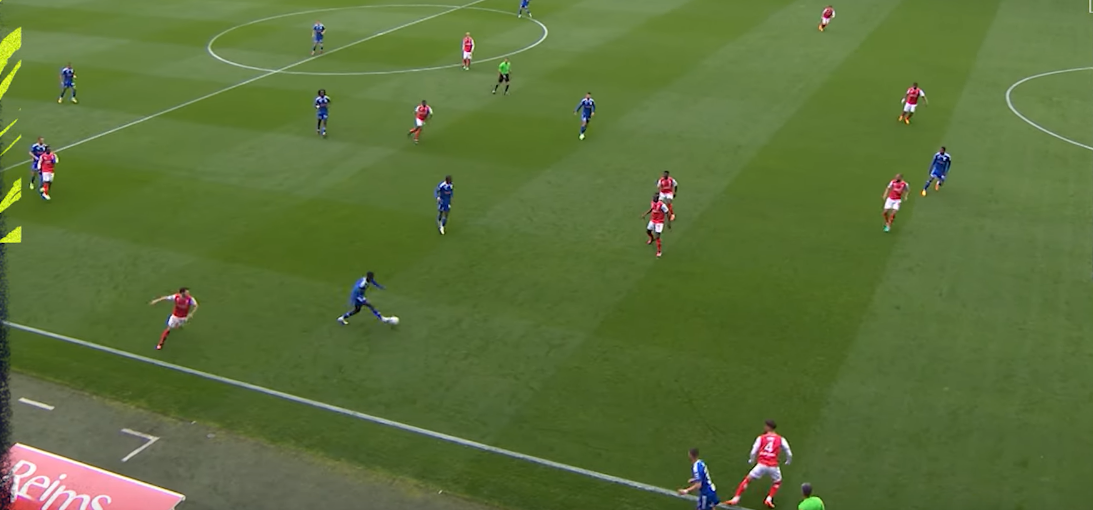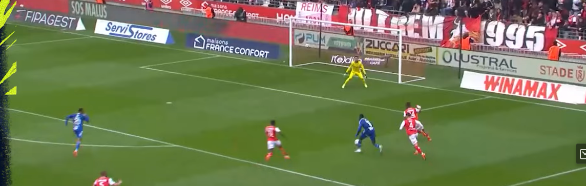 Diarra intercepts the poor attempt to play out, that’s a high turnover and a chance to finally split open Will Still’s Stade de Reims (racking up clean sheets playing um… 3 DMs to screen a back 4).
