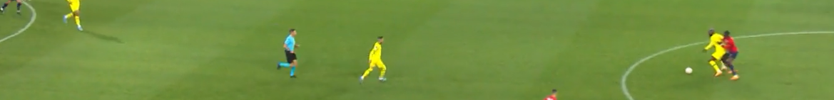 An uncannily similar play to the previous one, Onana is ready to get challenged nevertheless (the back arm for balance, or cushon the opponent.