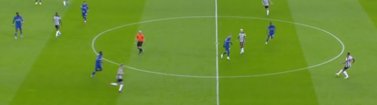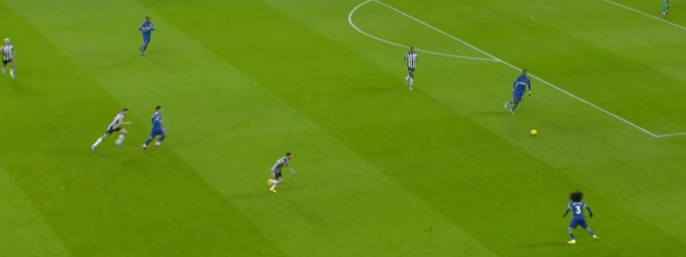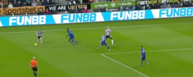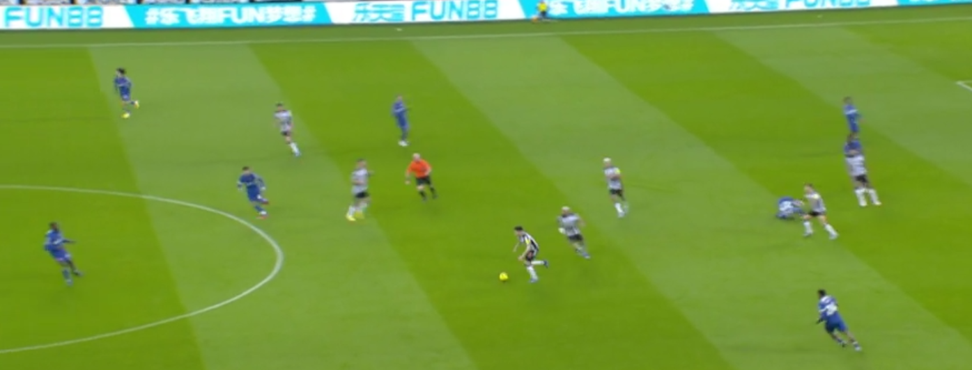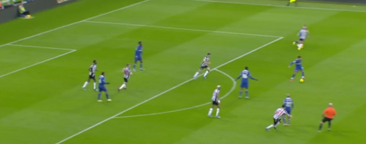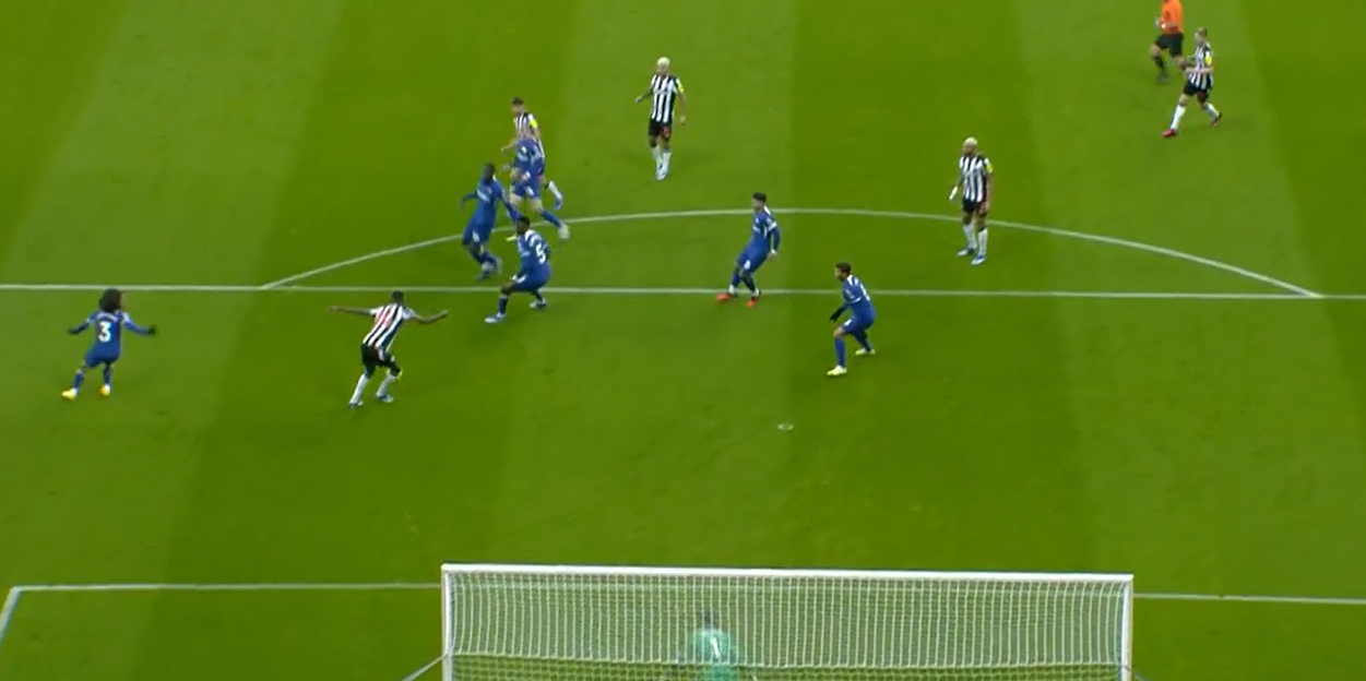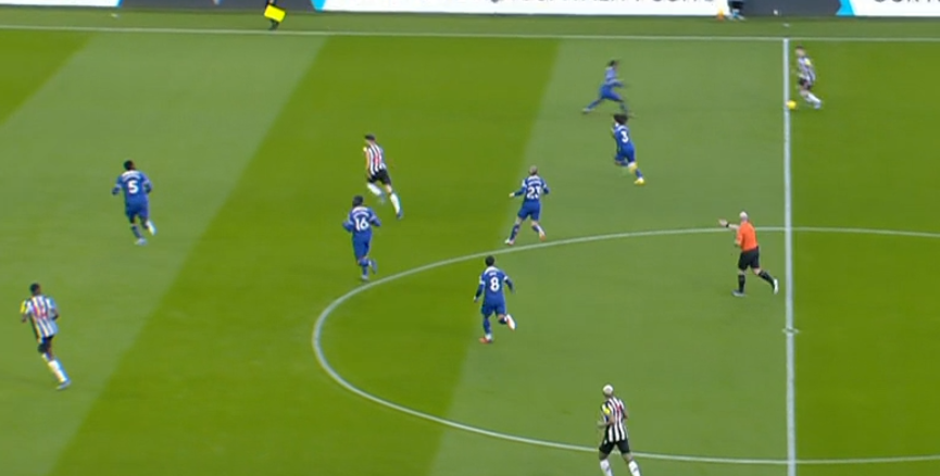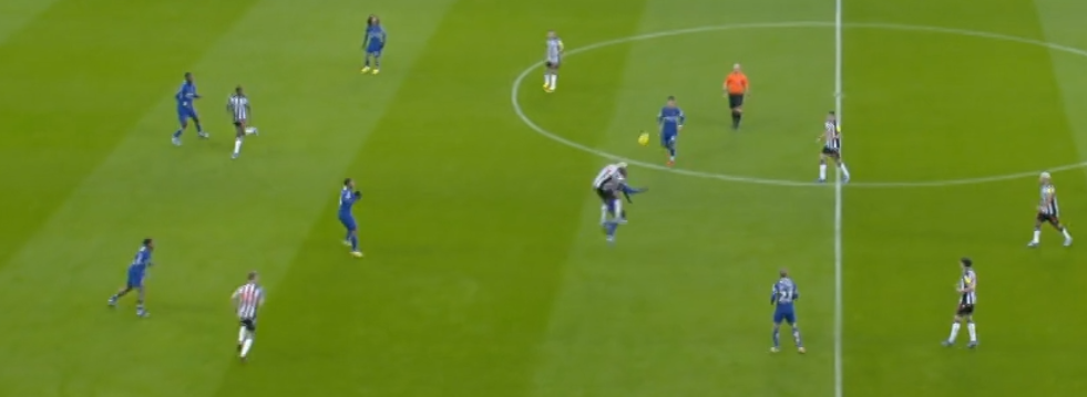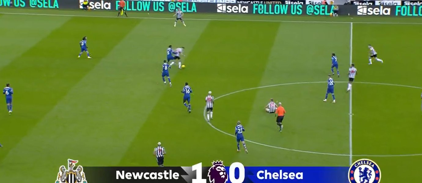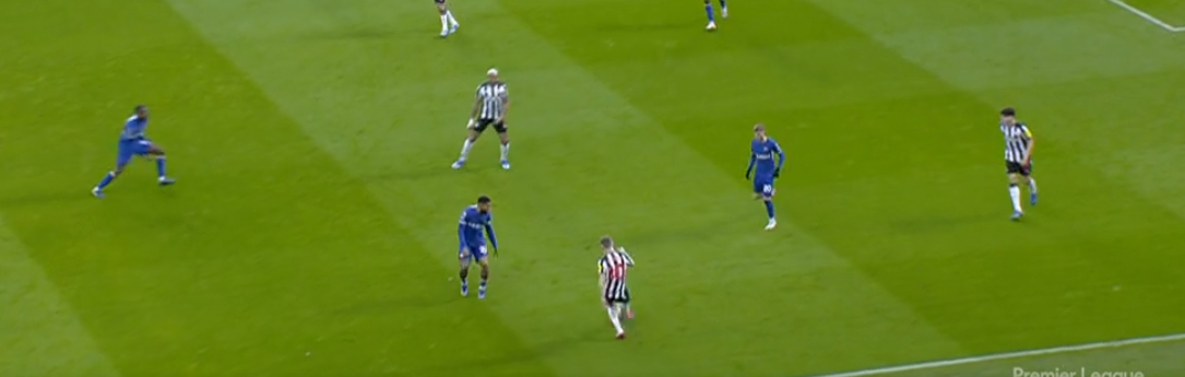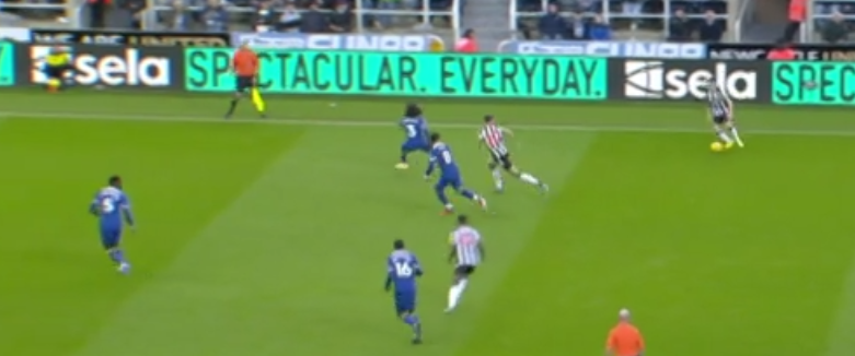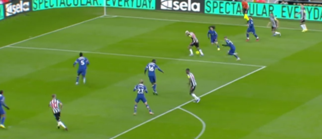 and finds a cluster of Chelsea defenders disrupted by Joelinton’s constant up and back movement to crash the back line