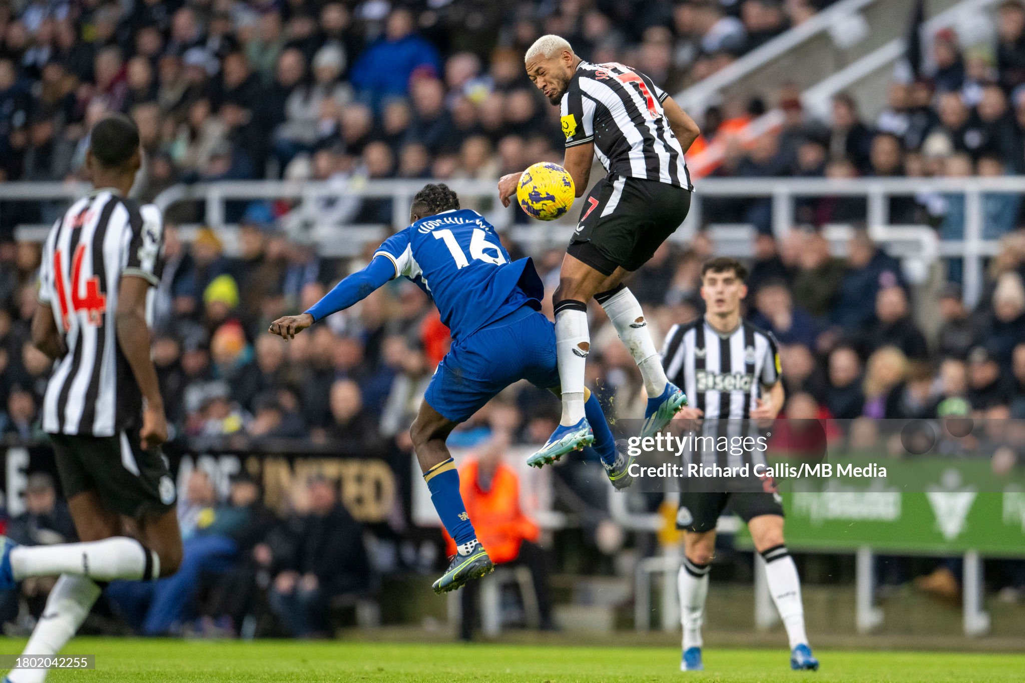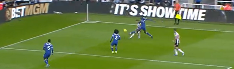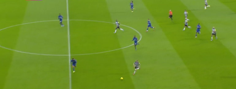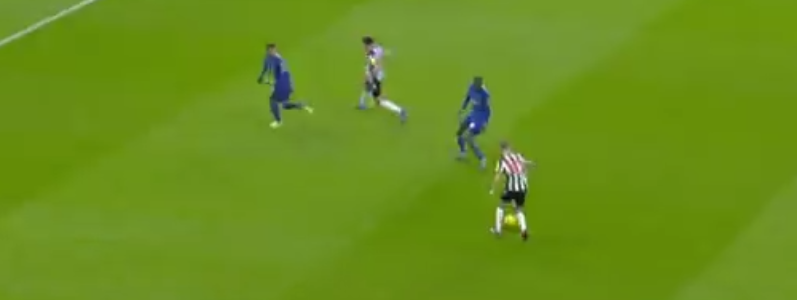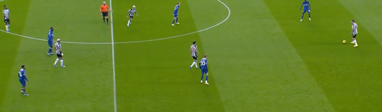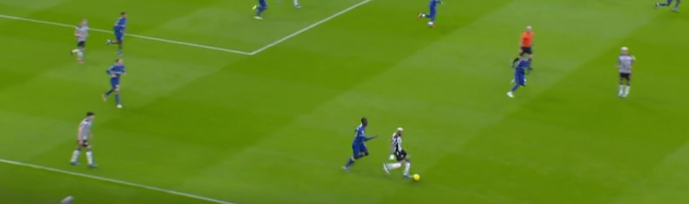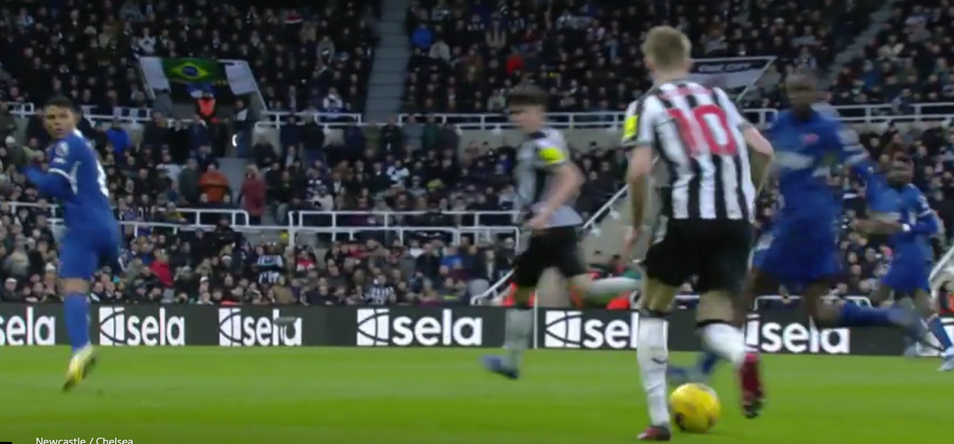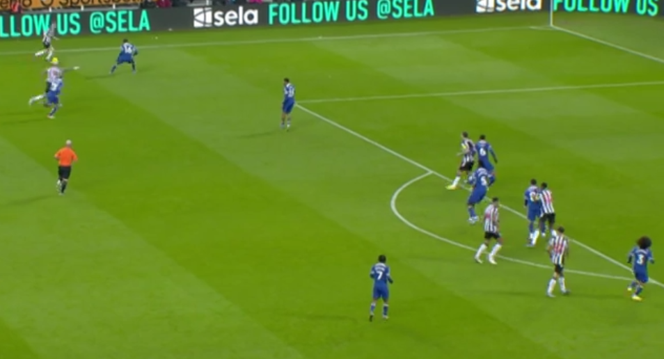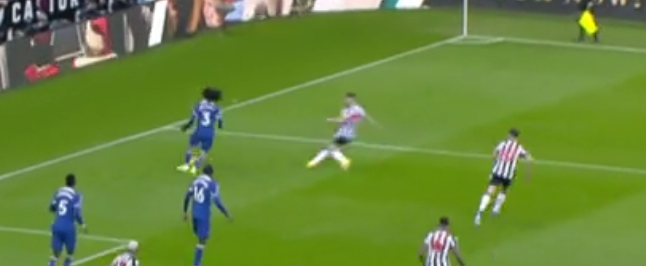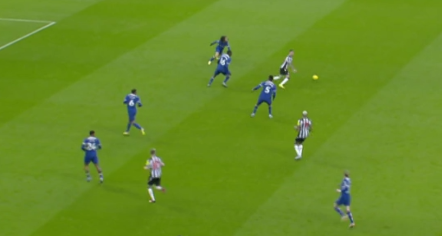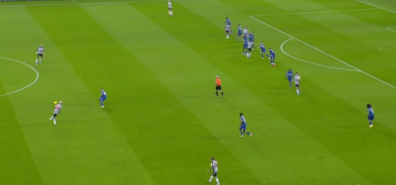 and finds a cluster of Chelsea defenders disrupted by Joelinton’s constant up and back movement to crash the back line