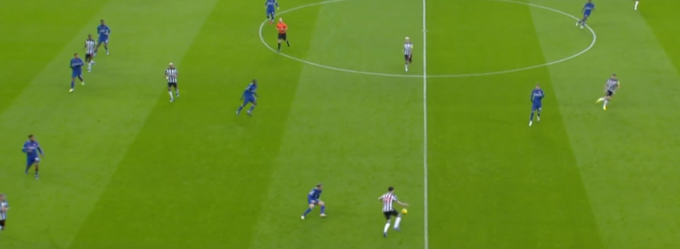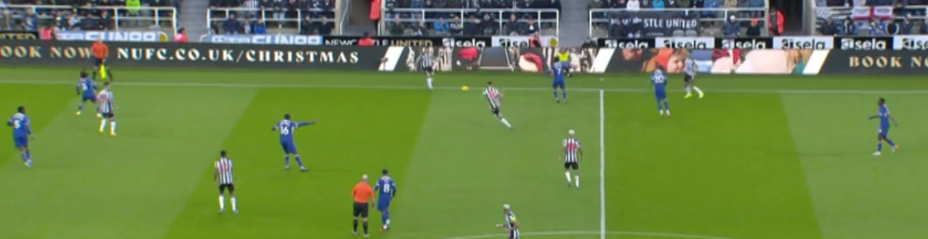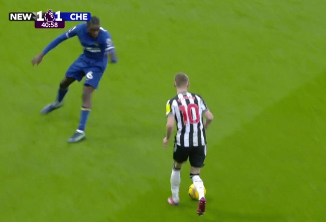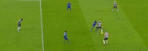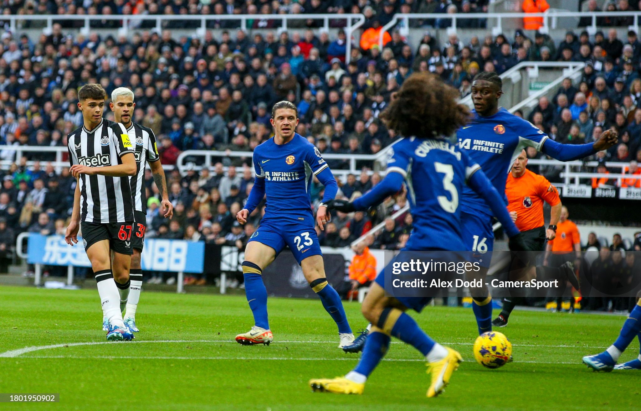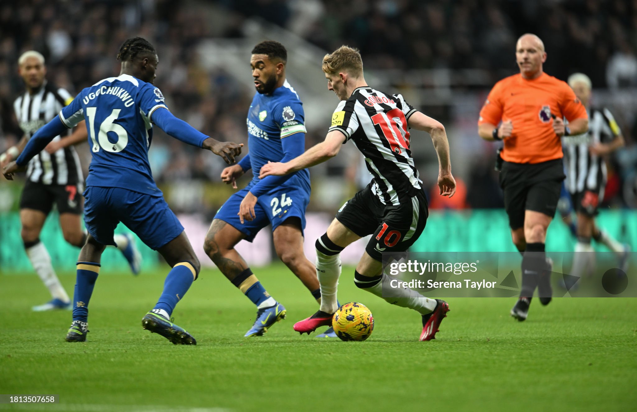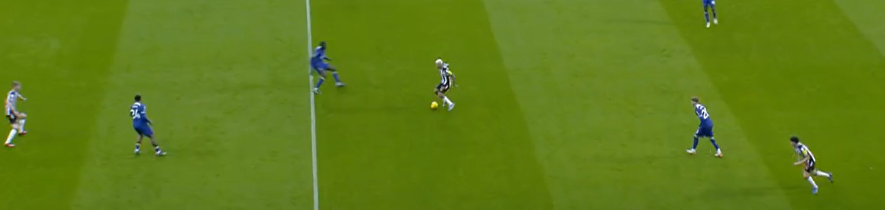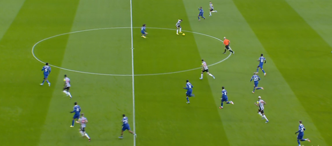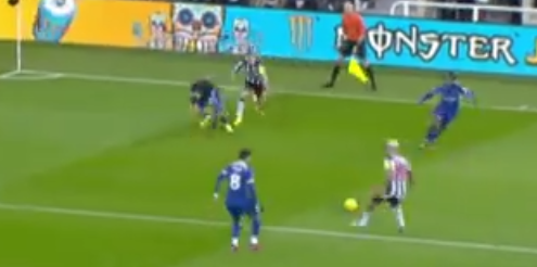 and finds a cluster of Chelsea defenders disrupted by Joelinton’s constant up and back movement to crash the back line