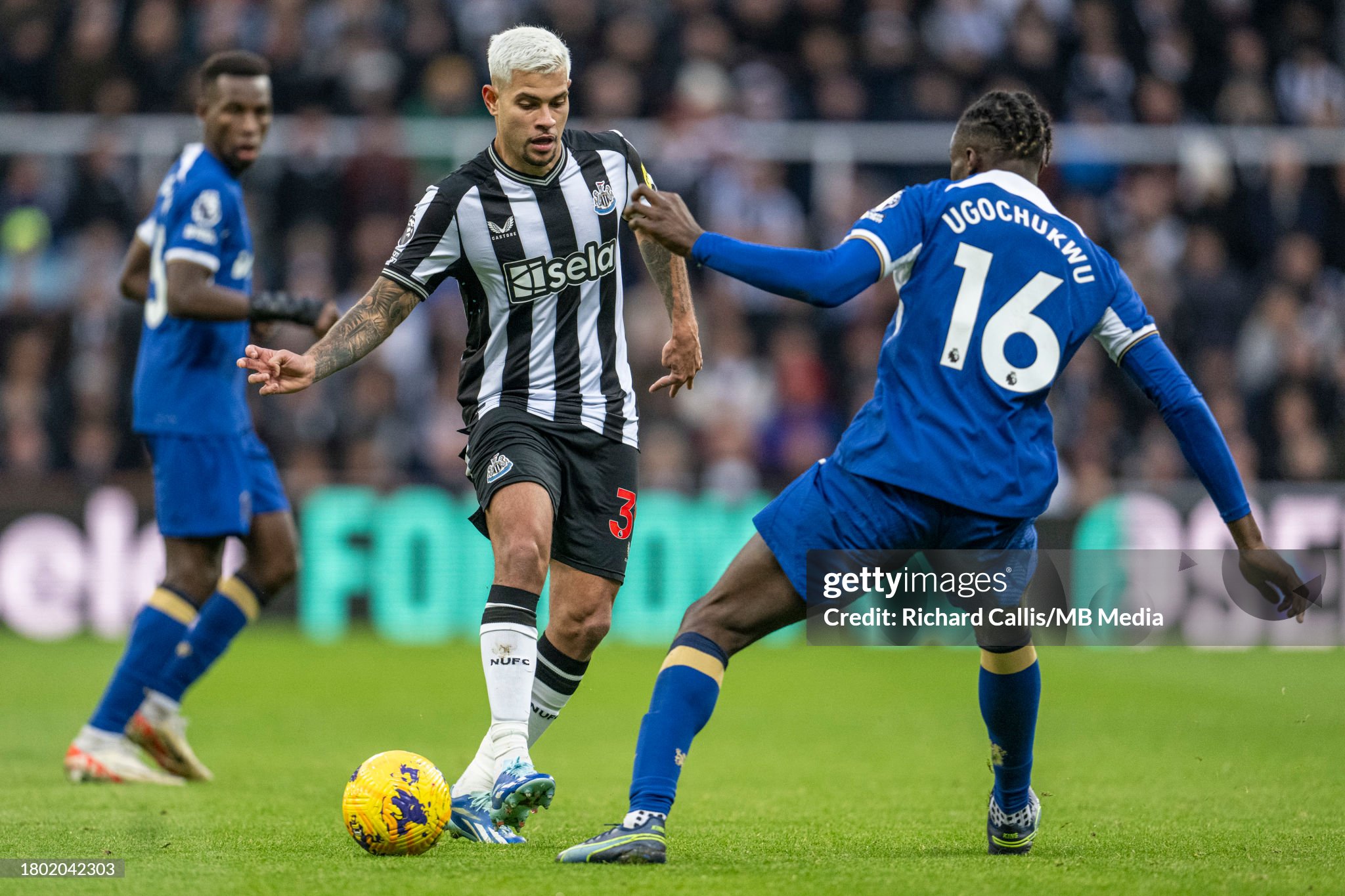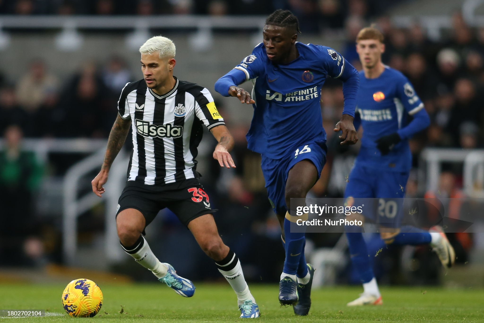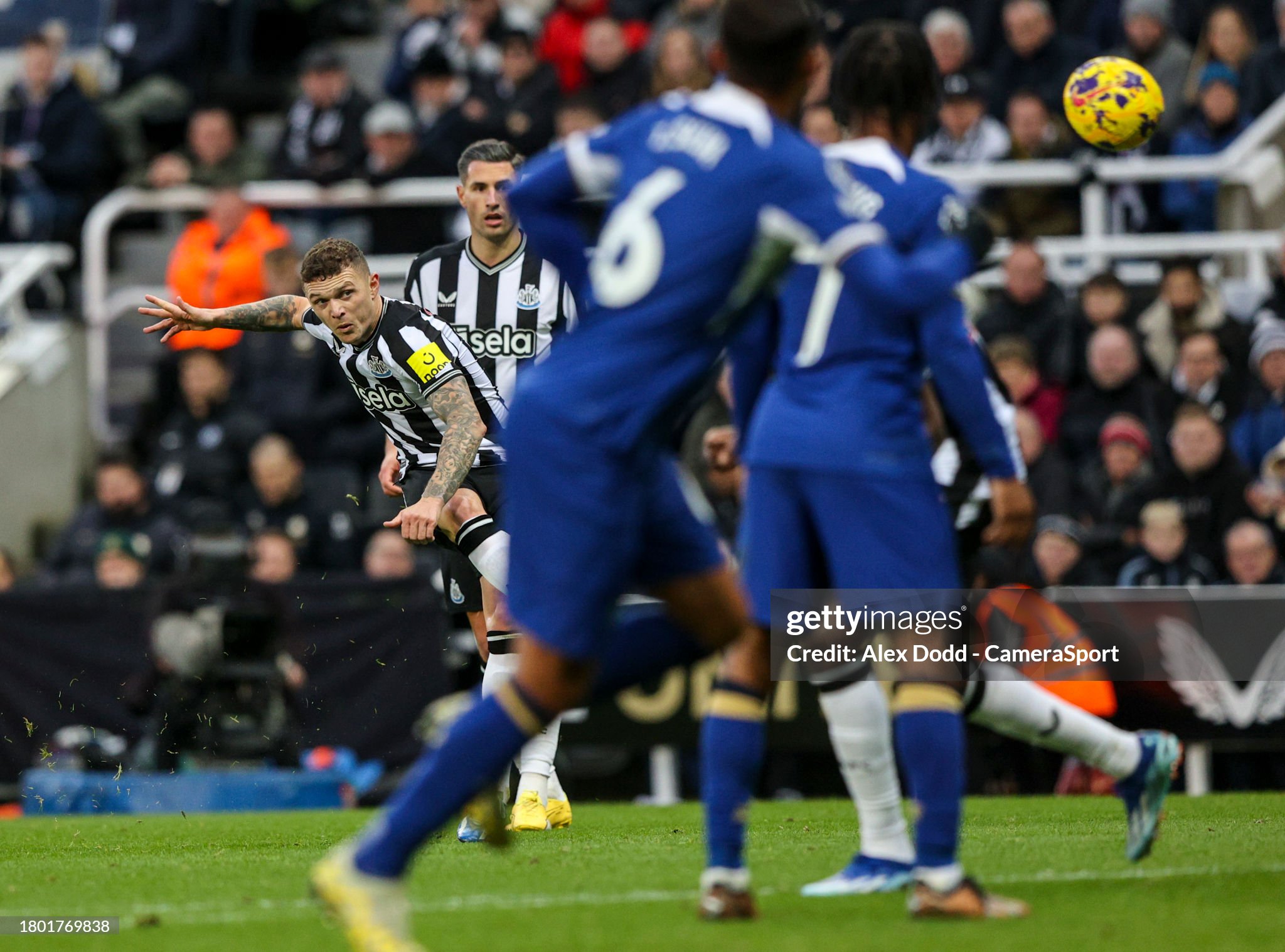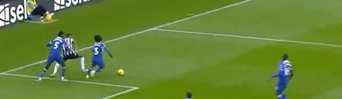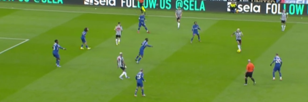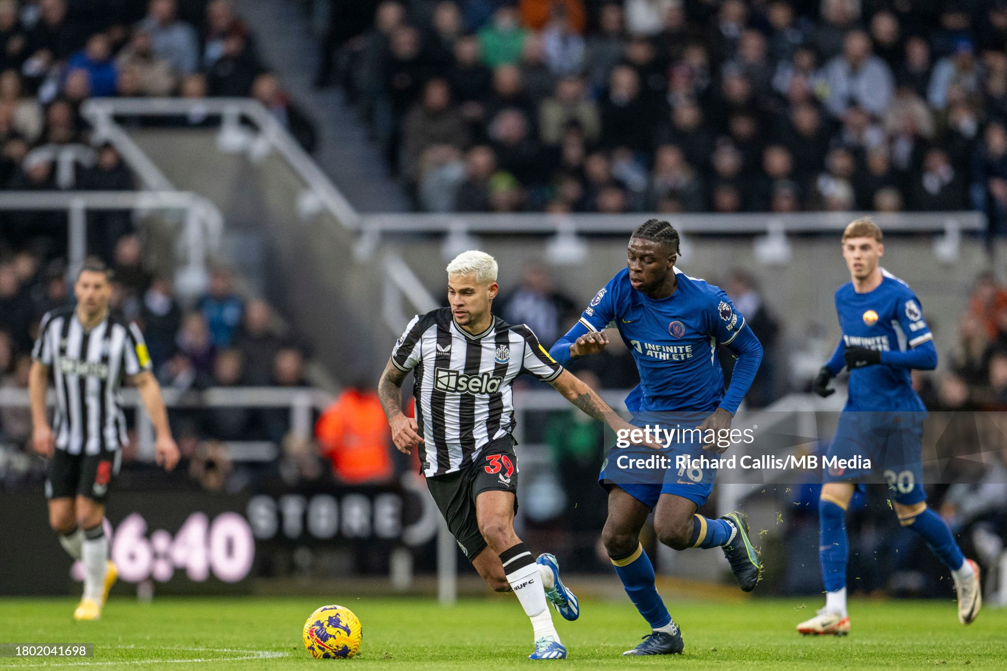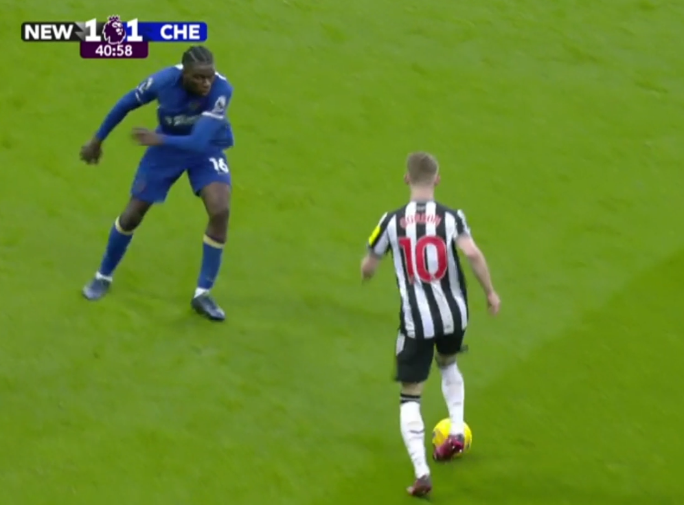 and finds a cluster of Chelsea defenders disrupted by Joelinton’s constant up and back movement to crash the back line