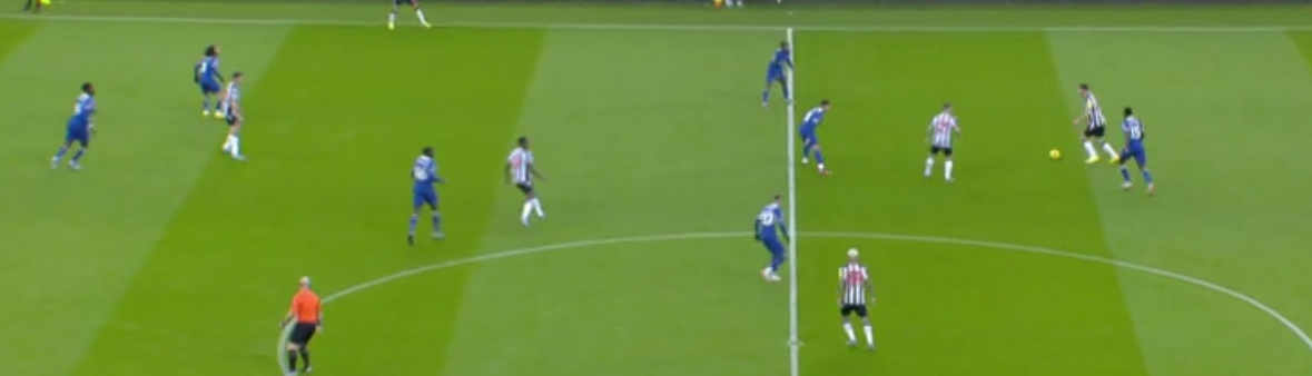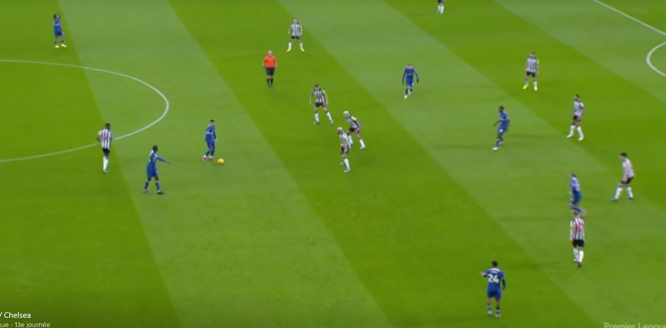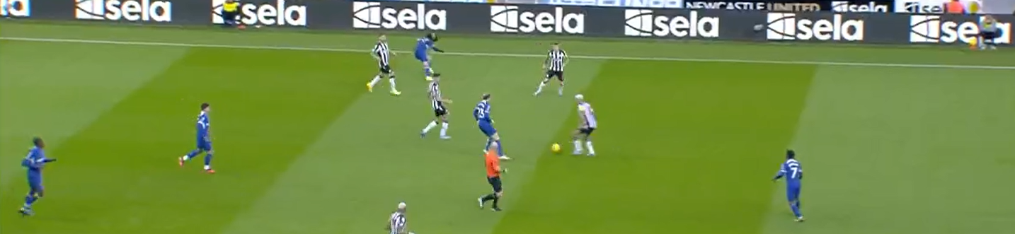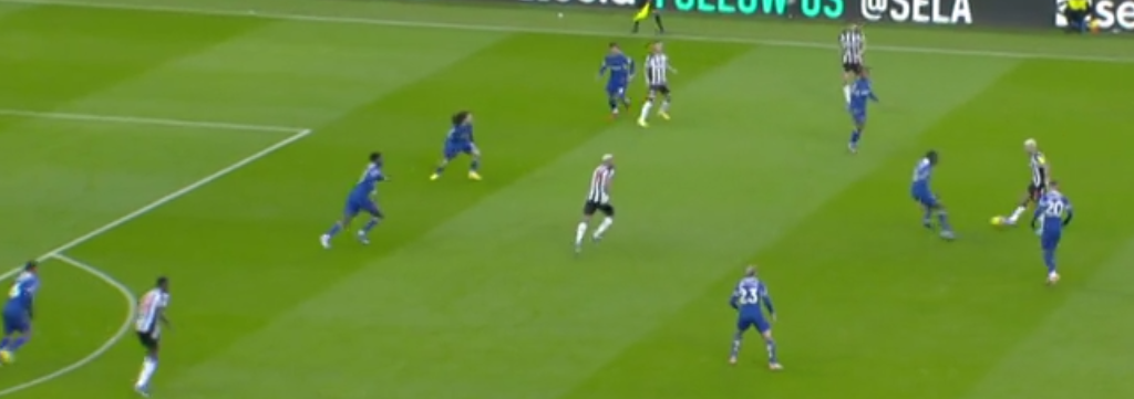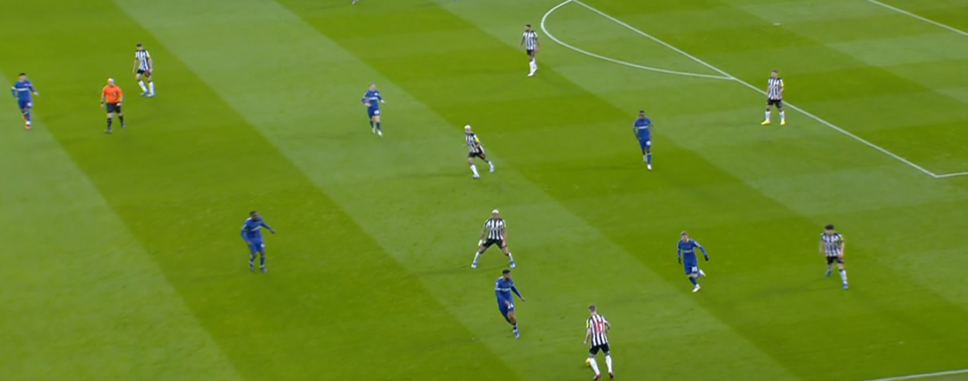 What Chelsea found difficult was that Newcastle decided to defend with a flat narrow line of 5 to shut down intervals, force needle passes.