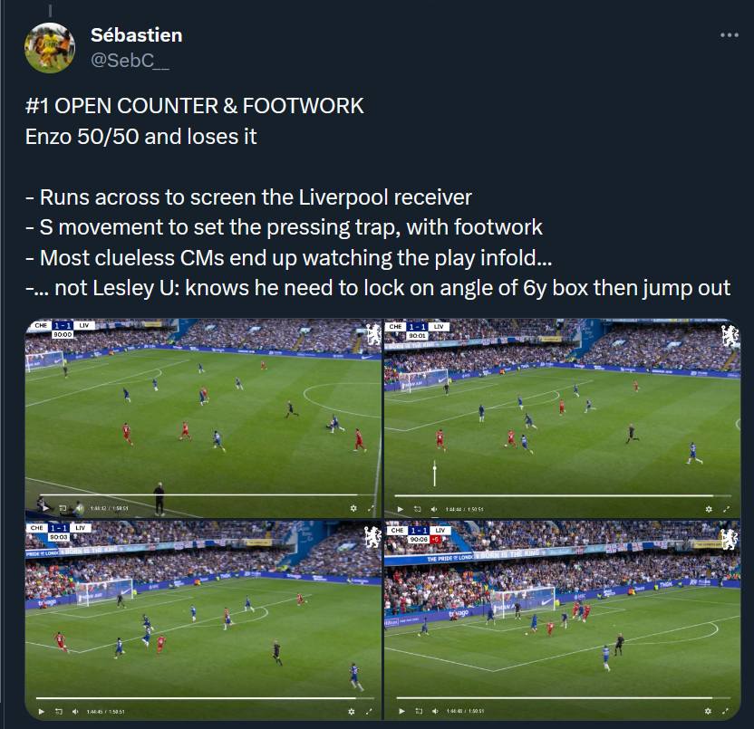 Defensive movement was spot on, alive and filling in every zone he had to: covering Enzo, covering the channel, making up as a situational CB or fullback, closing down opponents, preventive marking, crosses, cutbacks… It is alright to spend the first half doomscrolling / shitposting, but claiming “he isn’t levels” or “hasn’t been seen” just displays a critical lack of attention to the actual game (or understanding as to what happens) – plastering a poor pre-empted fan/hate fiction doesn’t work if one doesn’t have a clue.