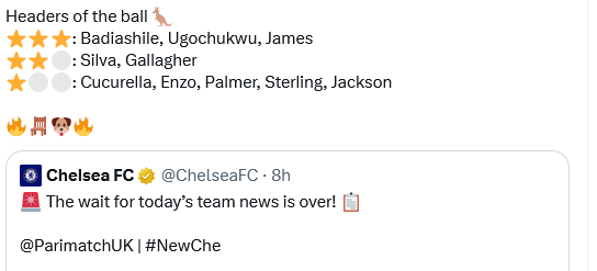 Chelsea have a line of 6 + 4 (Jackson mini-wall, Cucurella on Almiron and Sterling / Palmer out – the worst headers)