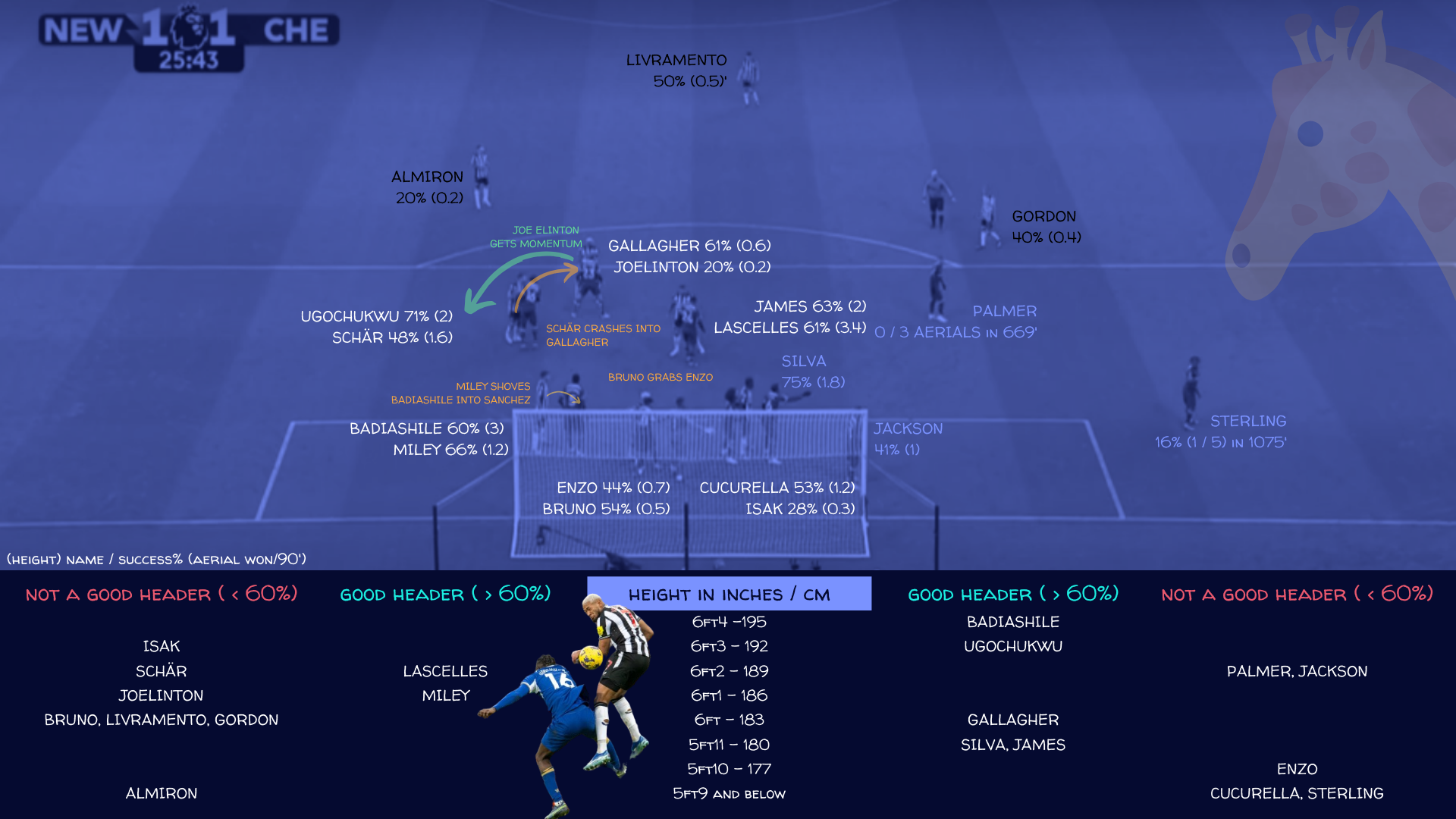 Chelsea’s squad building makes Ugochukwu the best (tall) header not being a defender, which certainly raises some questions when thinking of the design of other 100 points teams.