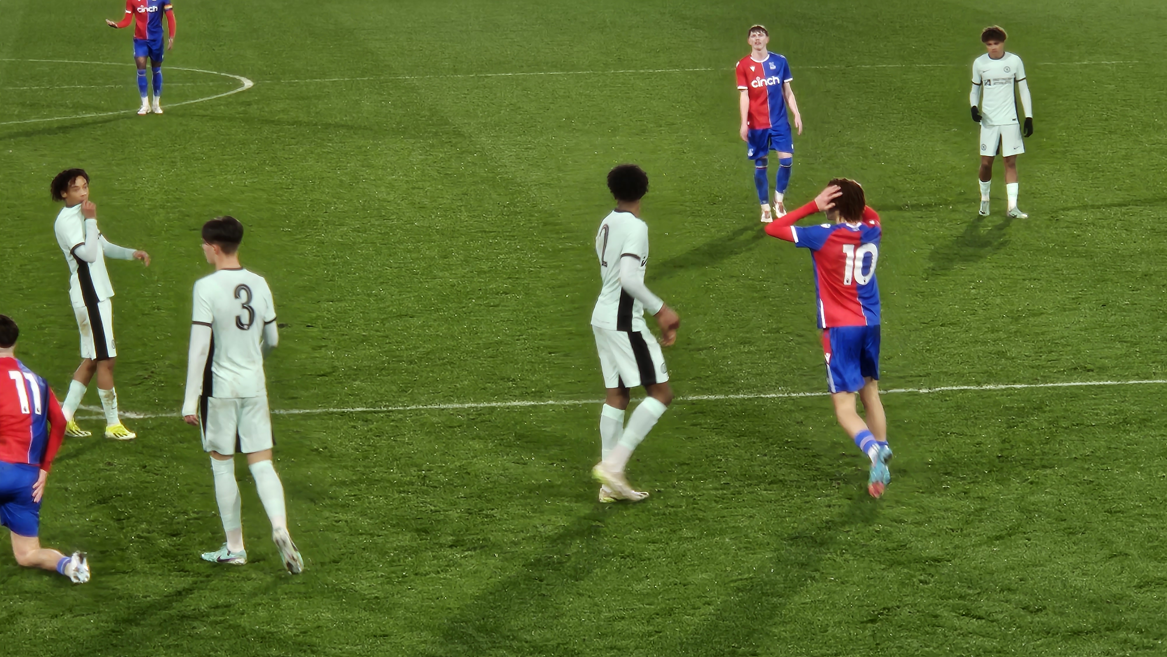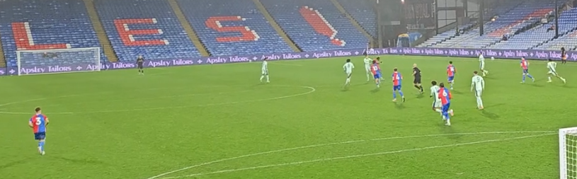 Harrison MC wins the header there, and if the second ball is blue/red and not eton blue, thatâs an easy 4v2 for Palace. Russell-Denny flicking it.