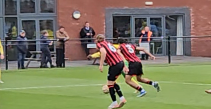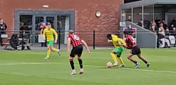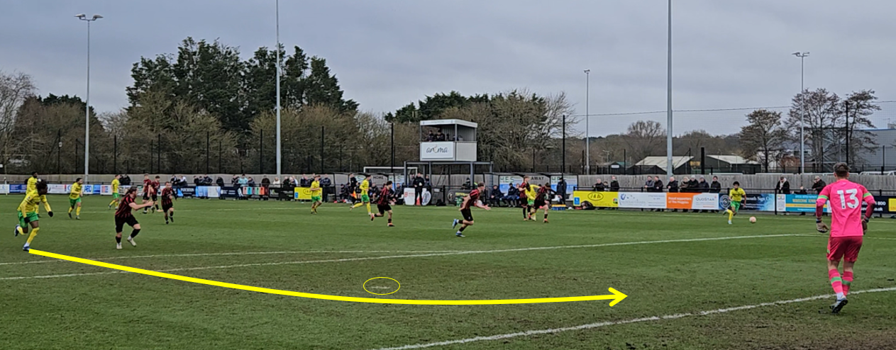 Because the attention is drawn to Aboh (10) who hits the channel, with a convincing run. Lewis Brown (4) is caught chasing shadows, drawn to Aboh
