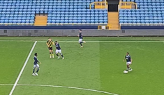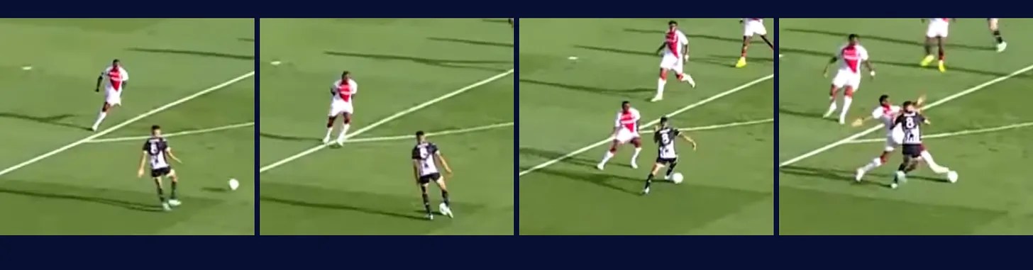 The same situation Ugochukwu faced (article below). Kalimuendo retains and spins, take a few steps back to open an angle to receive and play