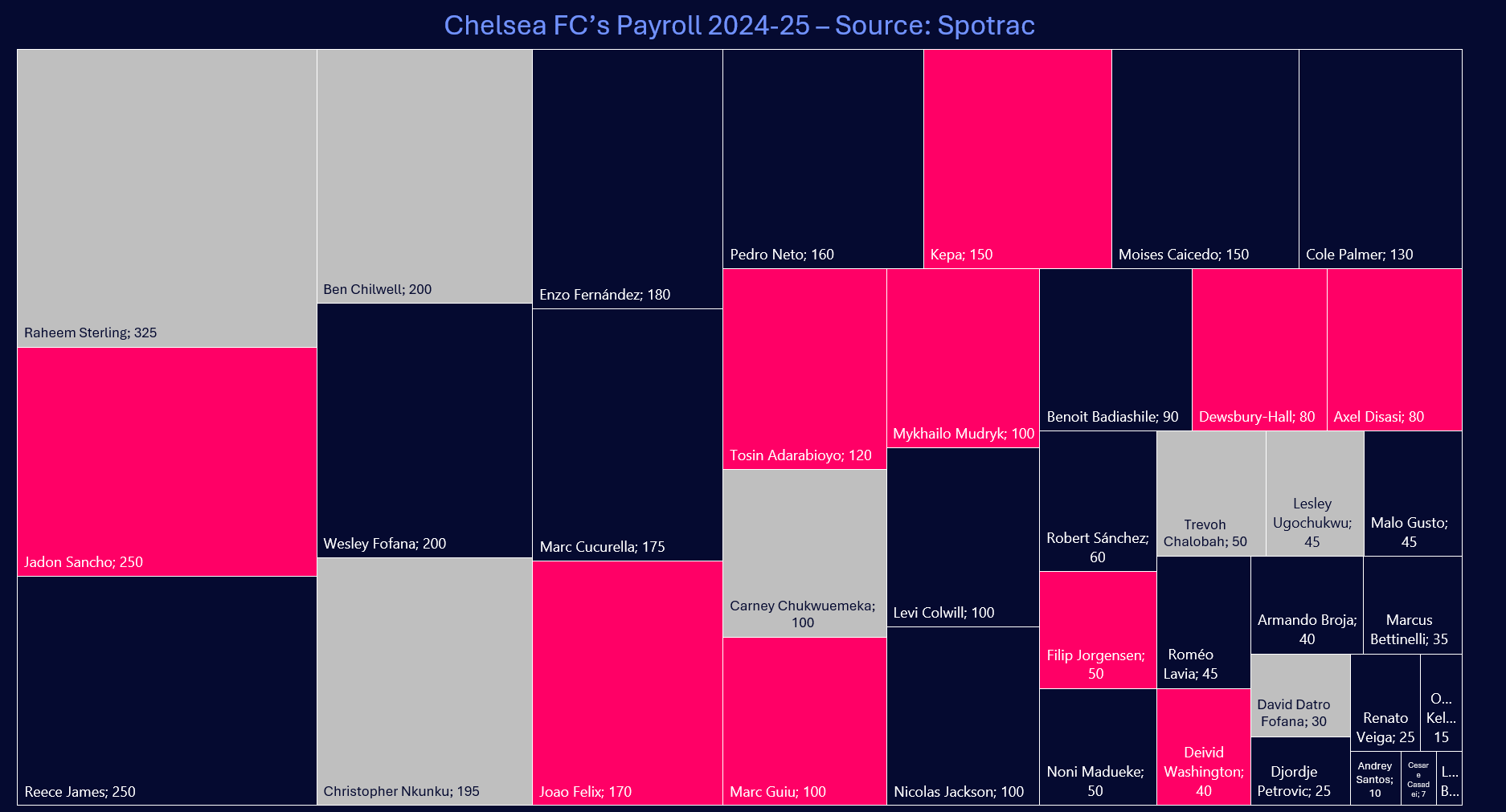 In Pink, is 50 million per year of players that are absolutely useless to Chelsea’s fortunes, for the hardly challengable assertion that the team currently somehow clings on to top 4 despite them not stepping a foot on the pitch.