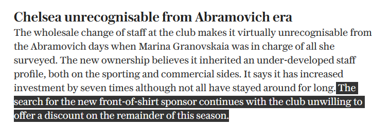 My limited understanding of english suggests sponsors “might” be interested for a 6 month caretaker role plastering whatever on Kiernan Dewsbury-Hall shirt (if he ever makes the matchday squad anymore after his 35 million transfer), but BlueCo demand the full season payment, in order to raise funds to pay 70% of Raheem Sterling’s wages whilst he’s out on loan, to create a pathway for Mikhailo Mudryk who’s currently provisionally suspended by the FA over ‘adverse finding’ in urine test