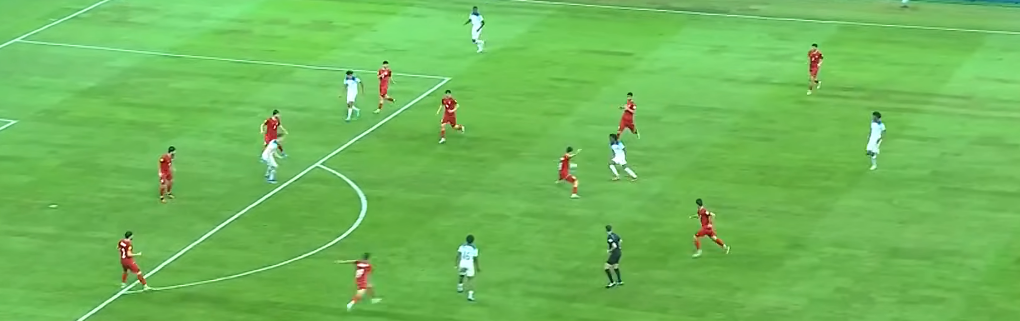 Diegzy is a nuisance here: pretends he defends and could foul 3 times, but just gets in the way and team mates can’t be drawn 2v1 and he has no chance to win it back.