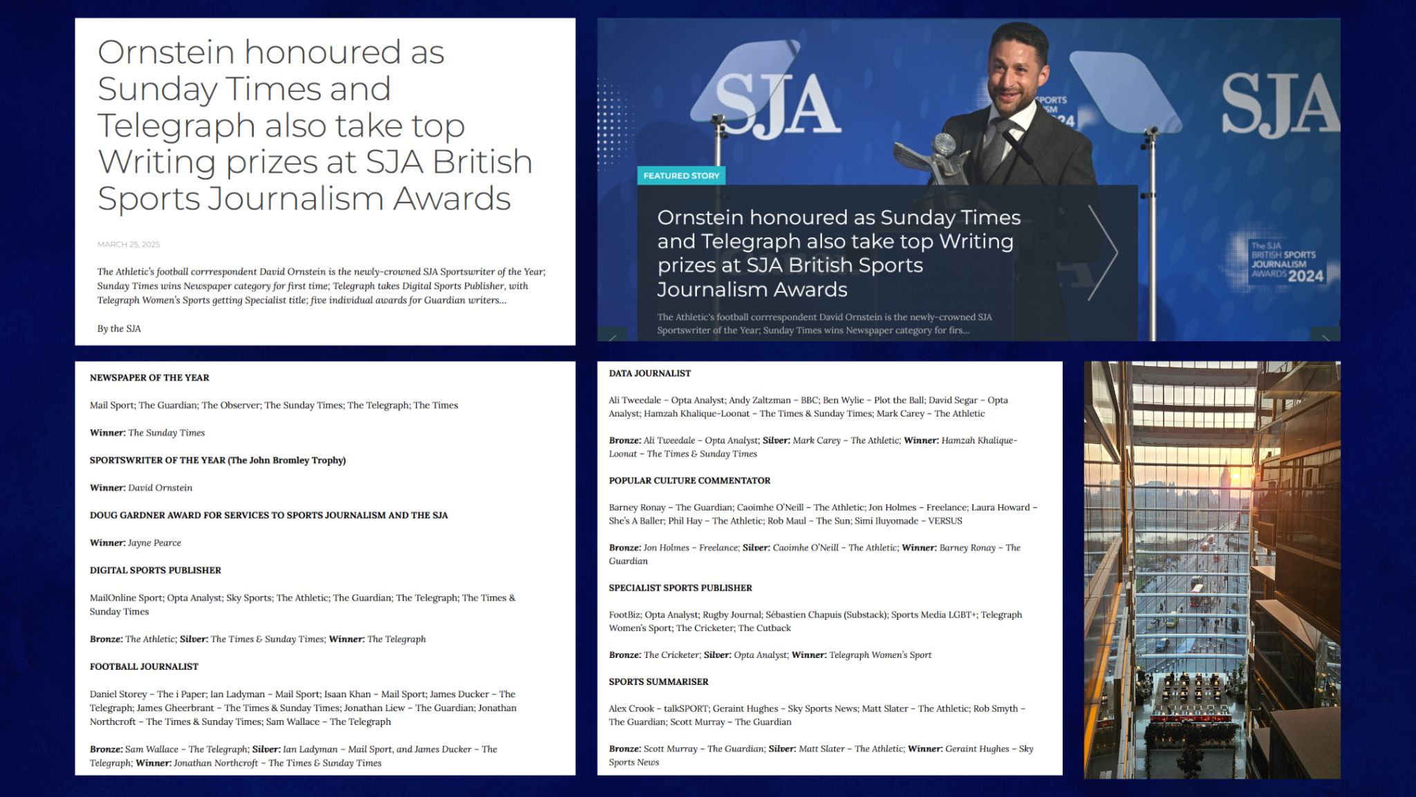 The Athletic’s football corrrespondent David Ornstein is the newly-crowned SJA Sportswriter of the Year; Sunday Times wins Newspaper category for first time; Telegraph takes Digital Sports Publisher, with Telegraph Women’s Sports getting Specialist title; five individual awards for Guardian writers…