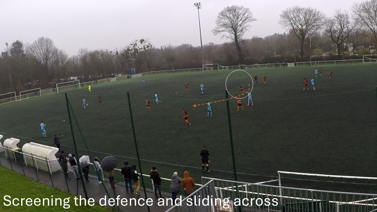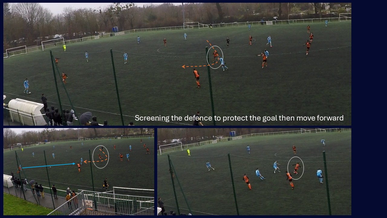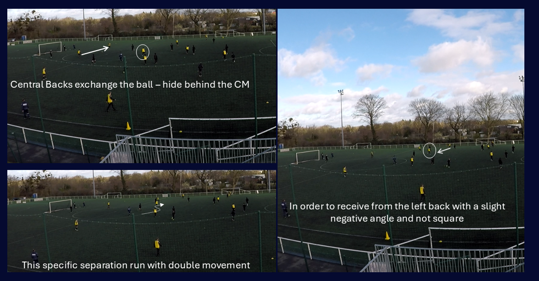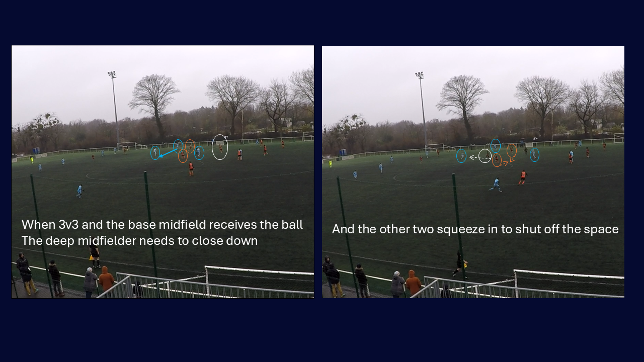 One of the coaching points I put the most emphasis on: defensive midfielder shuffling across to anticipate for turnovers and fill in the space. On this one, the player is guided in real time: made aware of the space he has to fill