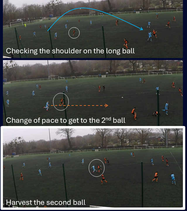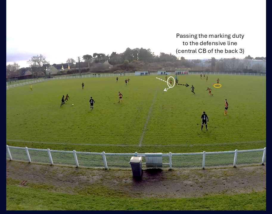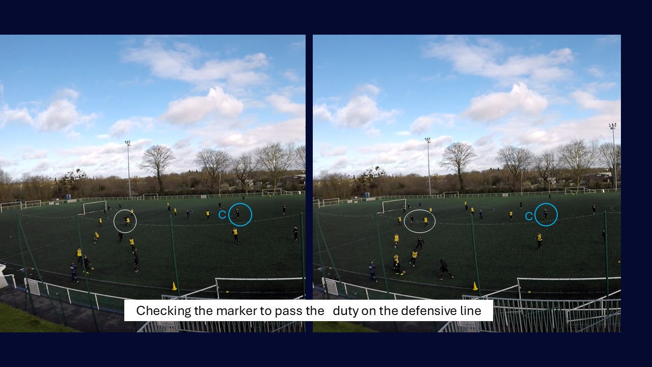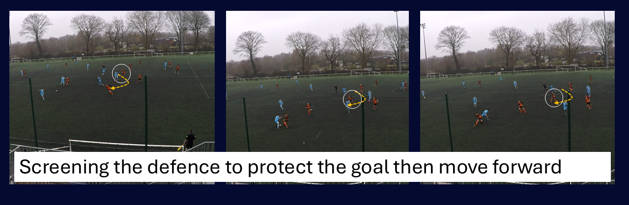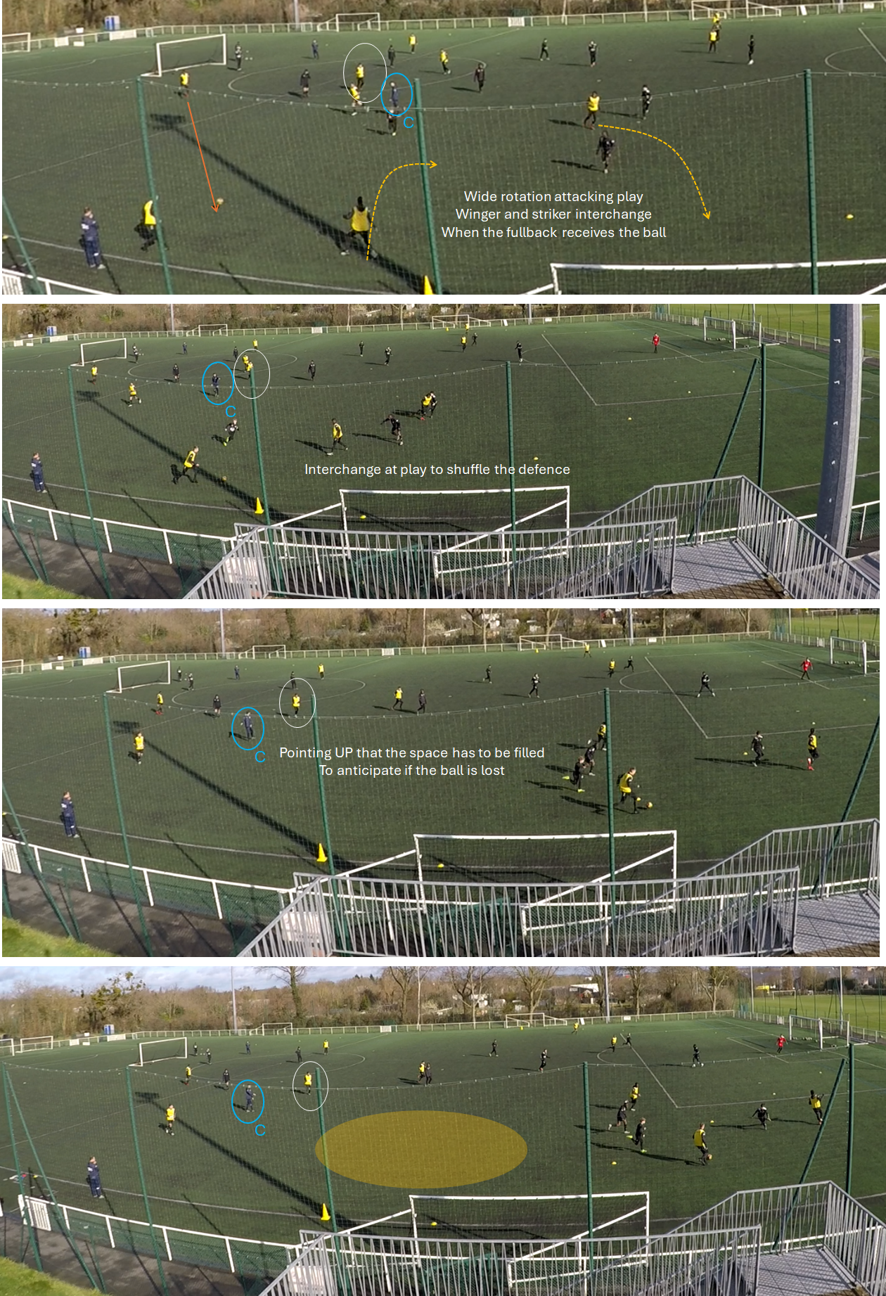 One of the coaching points I put the most emphasis on: defensive midfielder shuffling across to anticipate for turnovers and fill in the space. On this one, the player is guided in real time: made aware of the space he has to fill