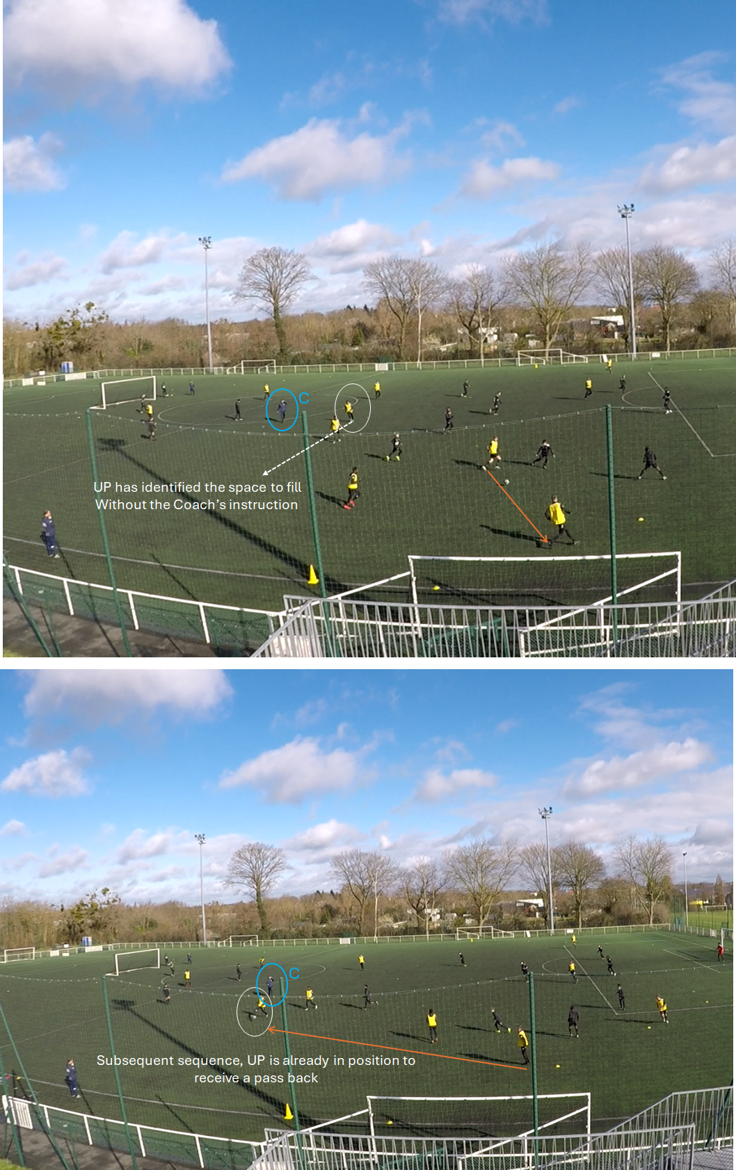 in the subsequent sequence, UP doesn’t need my intervention to identify the space and finds himself able to provide support and receive the pass