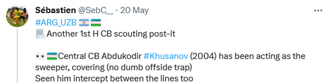 🇺🇿 Food for tacticos: Khusanov was in the middle of the back 3, but often jumping a step ahead to disrupt Argentina U20’s pressing