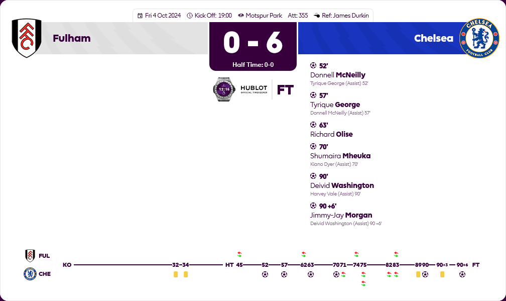 Chelsea(3-4-2-1): Max Merrick; Brodi Hughes (Harrison Murray-Campbell 82), Kaiden Wilson, Ishe Sameuls-Smith; Ricard Olise, Alex Matos (Sam Rak-Sakyi 82), Kiano Dyer, Harvey Vale (c); Donnell McNeilly (Deivid Washington 75), Tyrique George (Zain Silcott-Duberry 75); Shumaira Mheuka (Jimmy-Jay Morgan 71)
